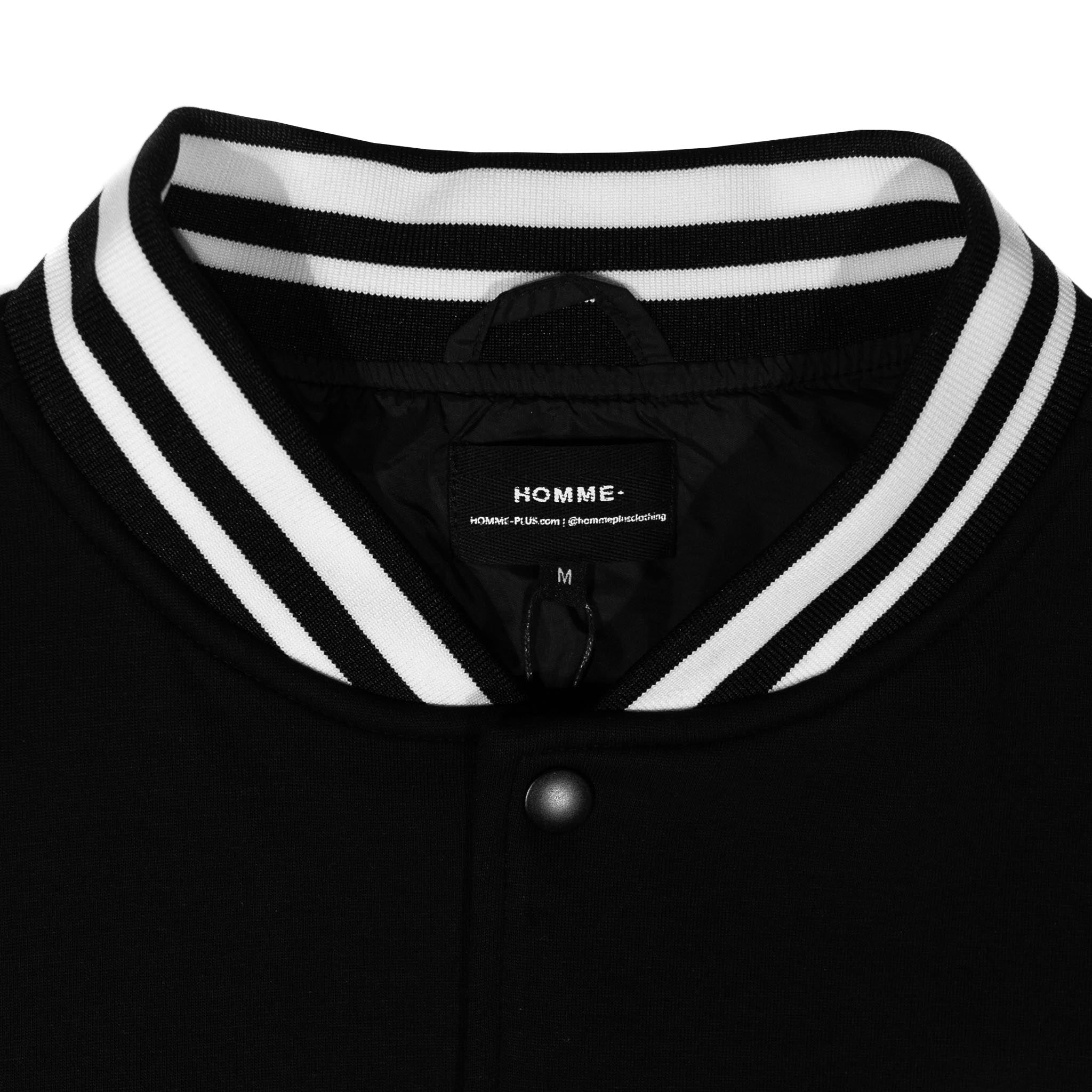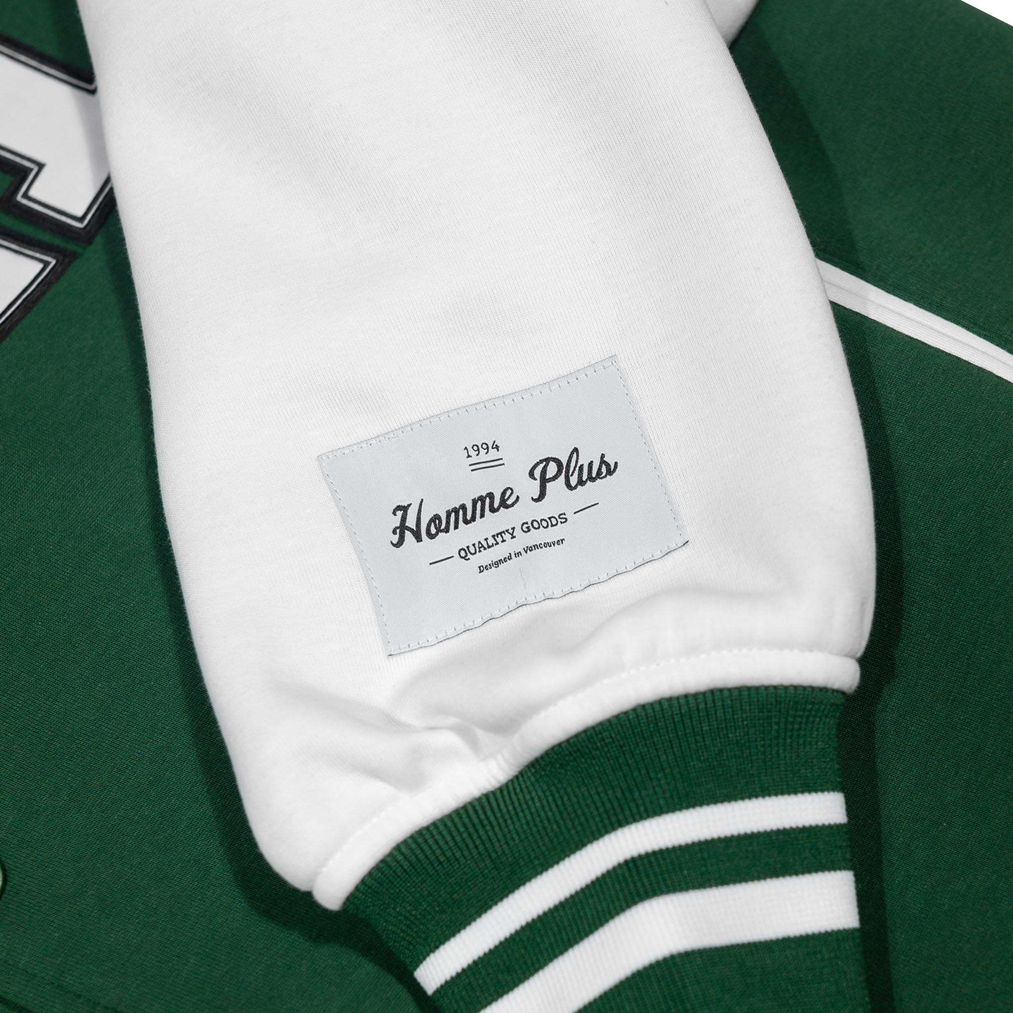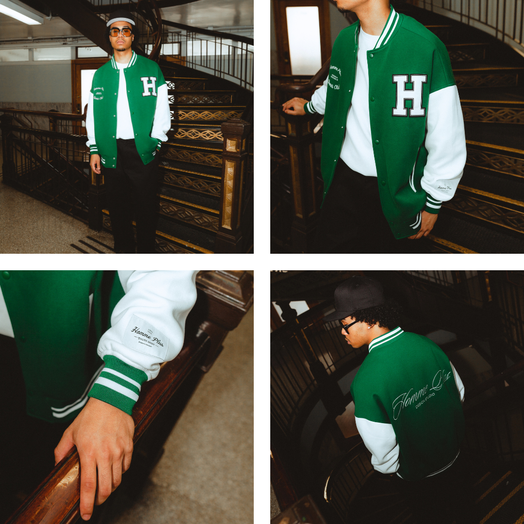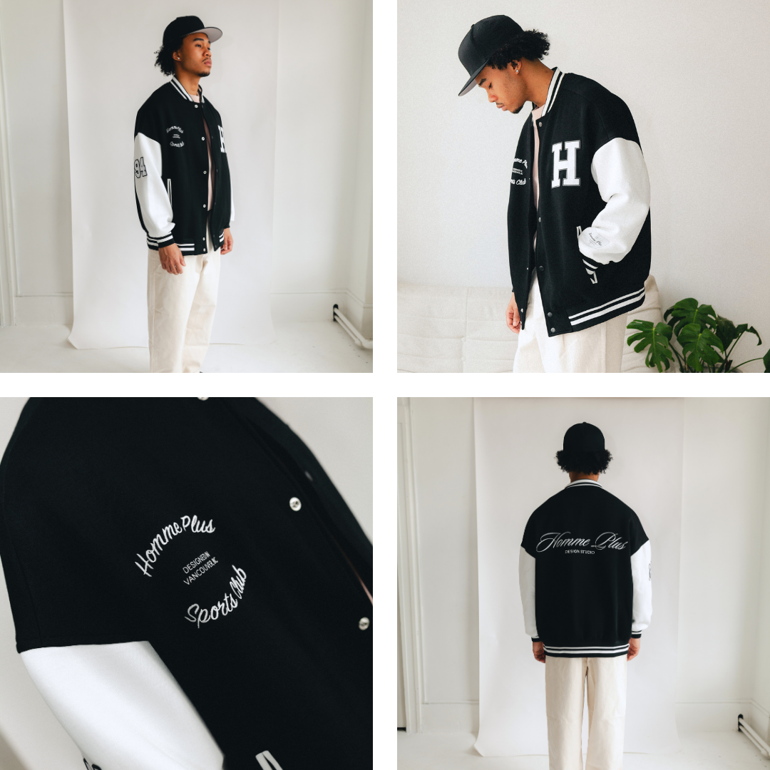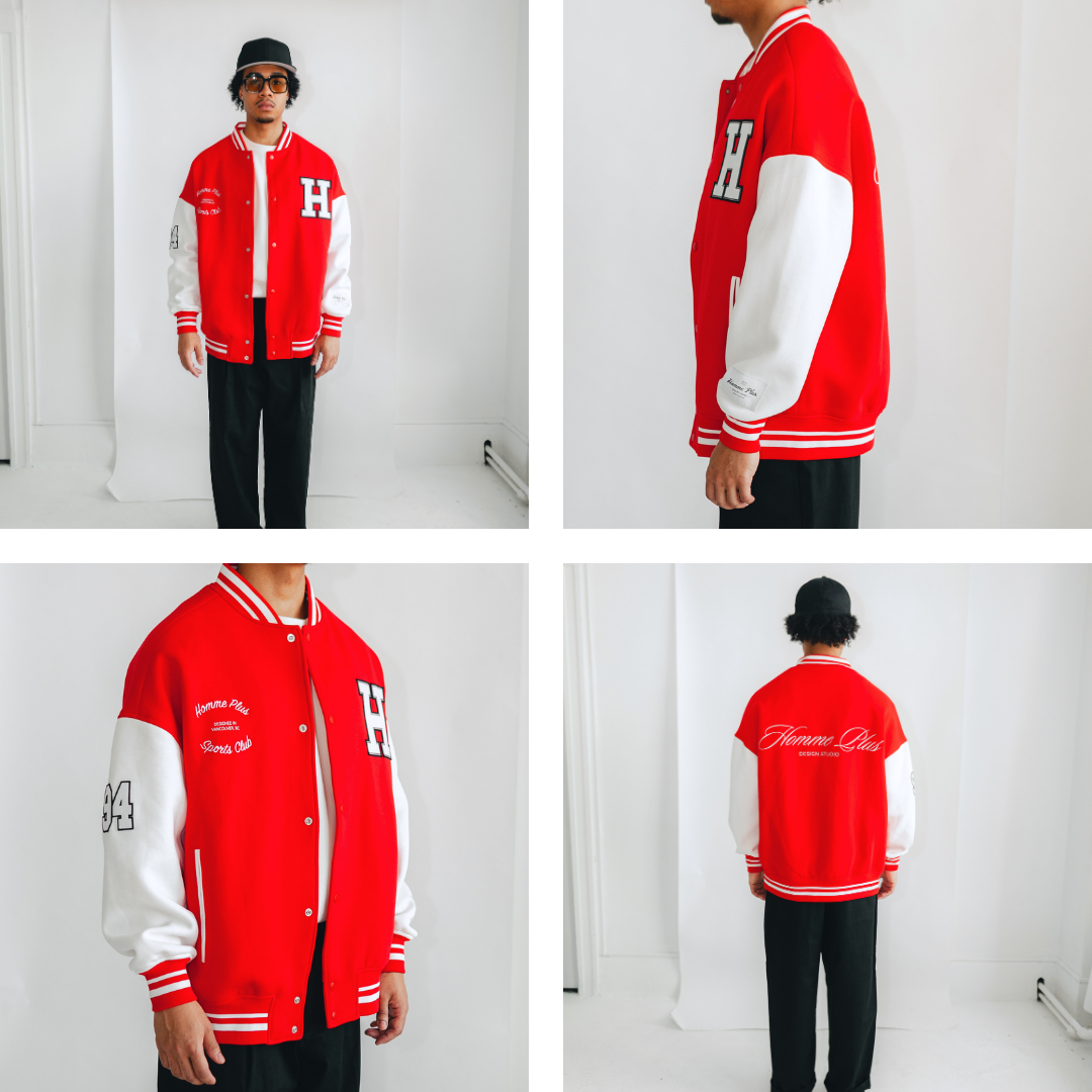 The HOMME+ Varsity Jacket delivers a classic collegiate aesthetic with its oversized fit and detailed embellishments. Featuring a woven label, fine embroidery, bold patches, and a statement back print, this jacket offers a contemporary take on a timeless style with functional interior elements.