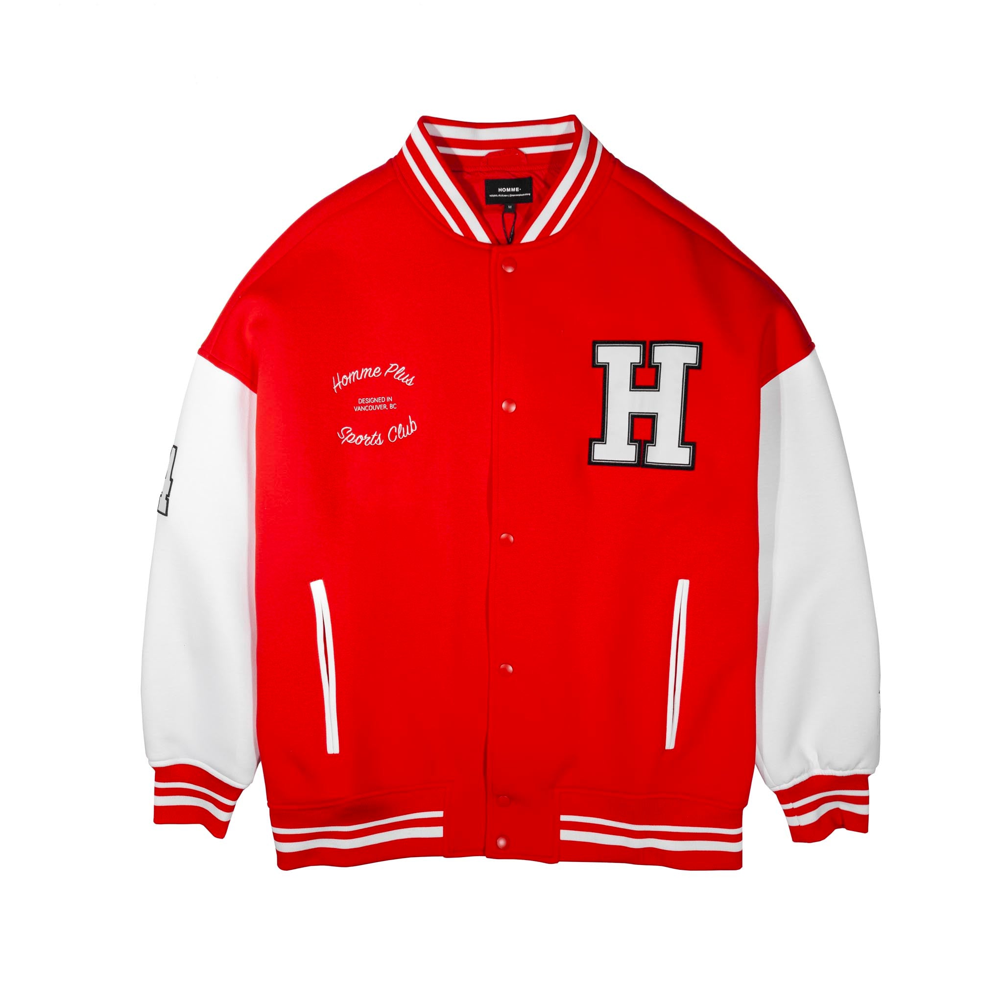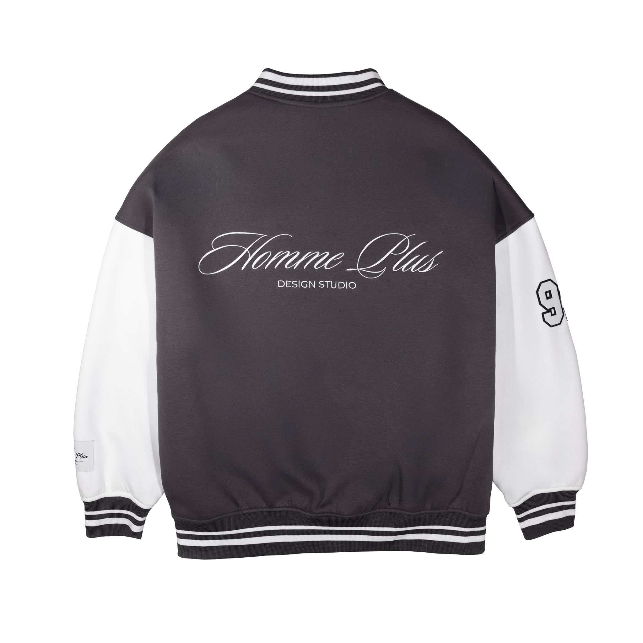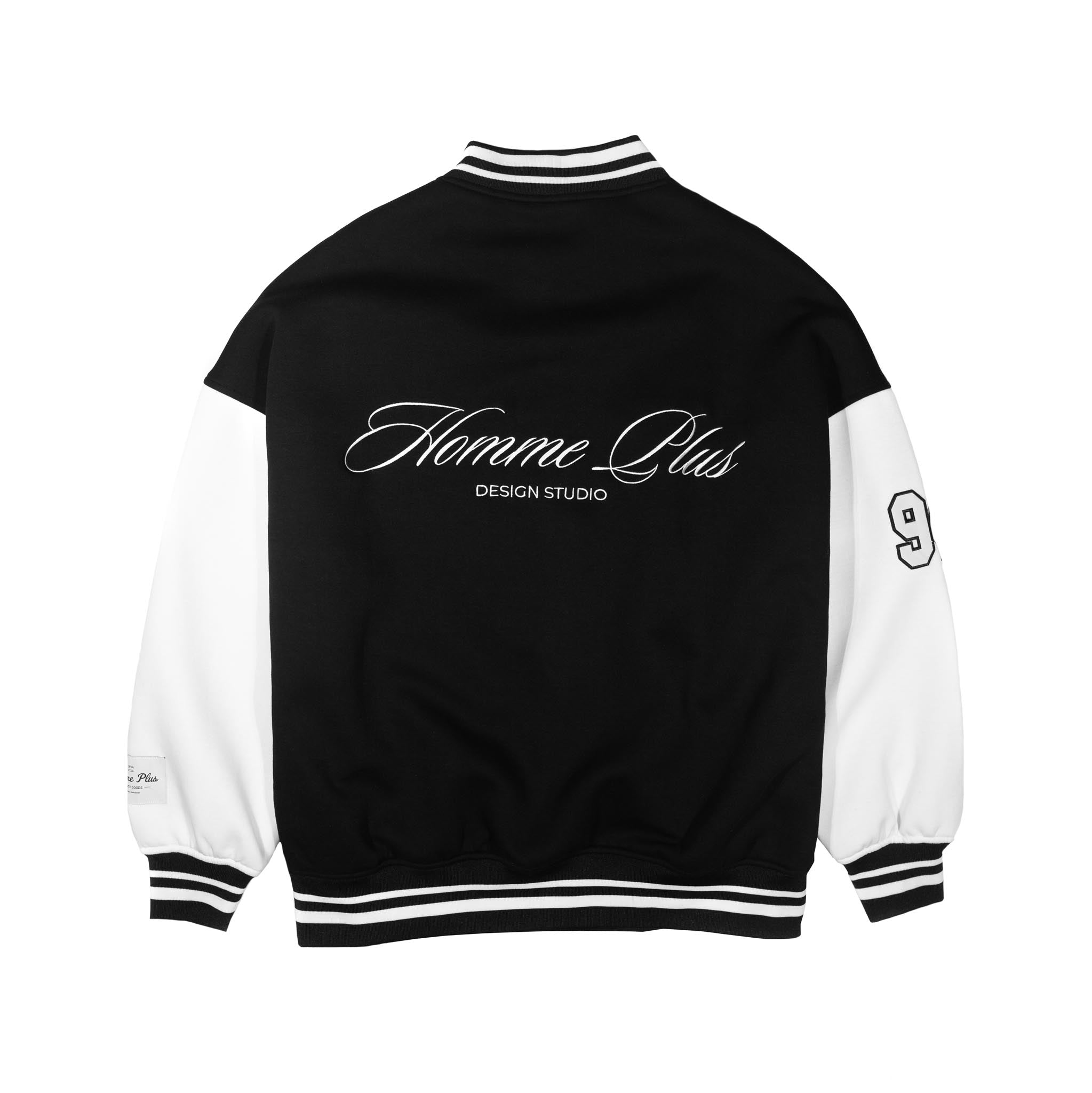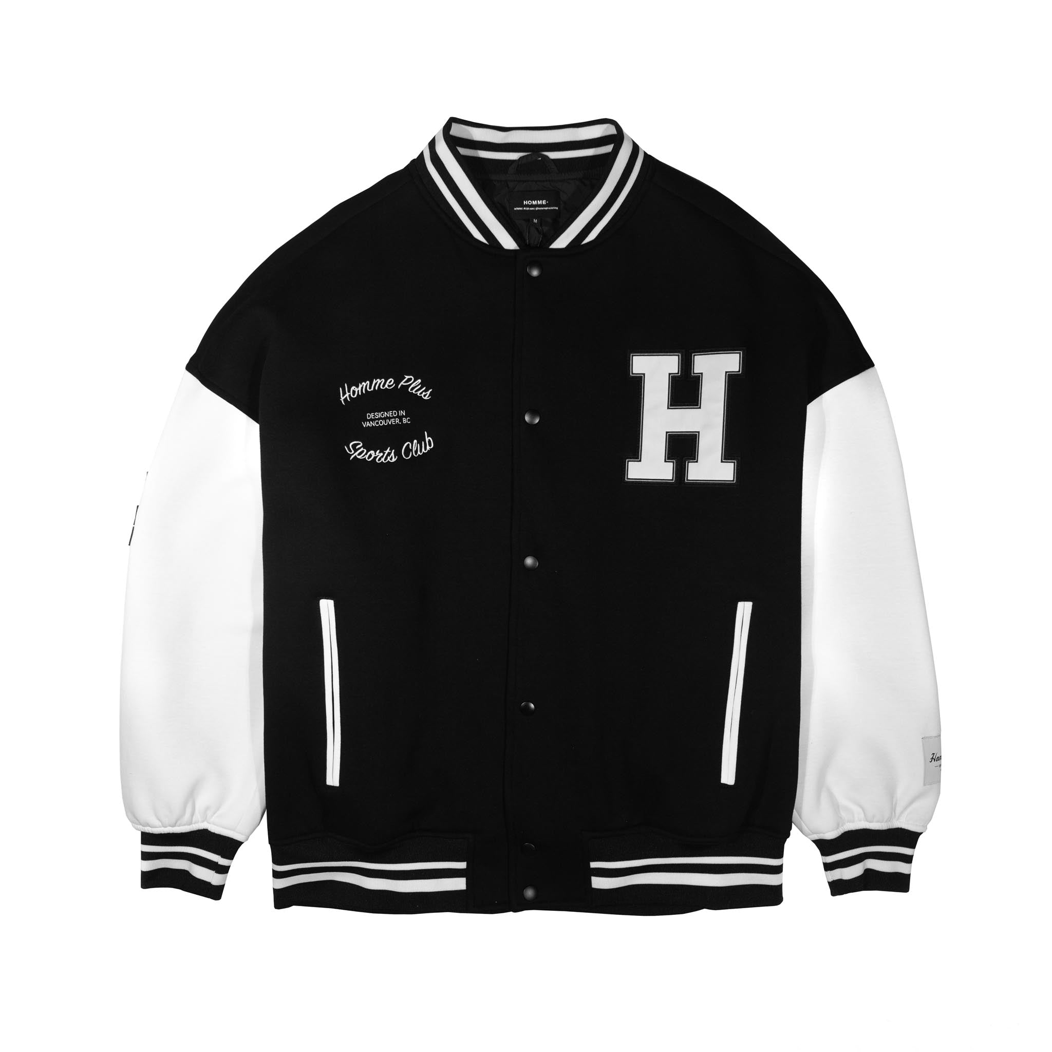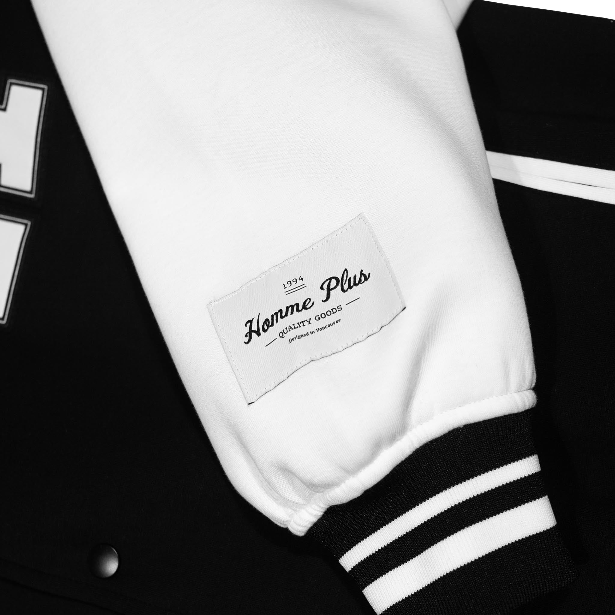 The HOMME+ Varsity Jacket delivers a classic collegiate aesthetic with its oversized fit and detailed embellishments. Featuring a woven label, fine embroidery, bold patches, and a statement back print, this jacket offers a contemporary take on a timeless style with functional interior elements.