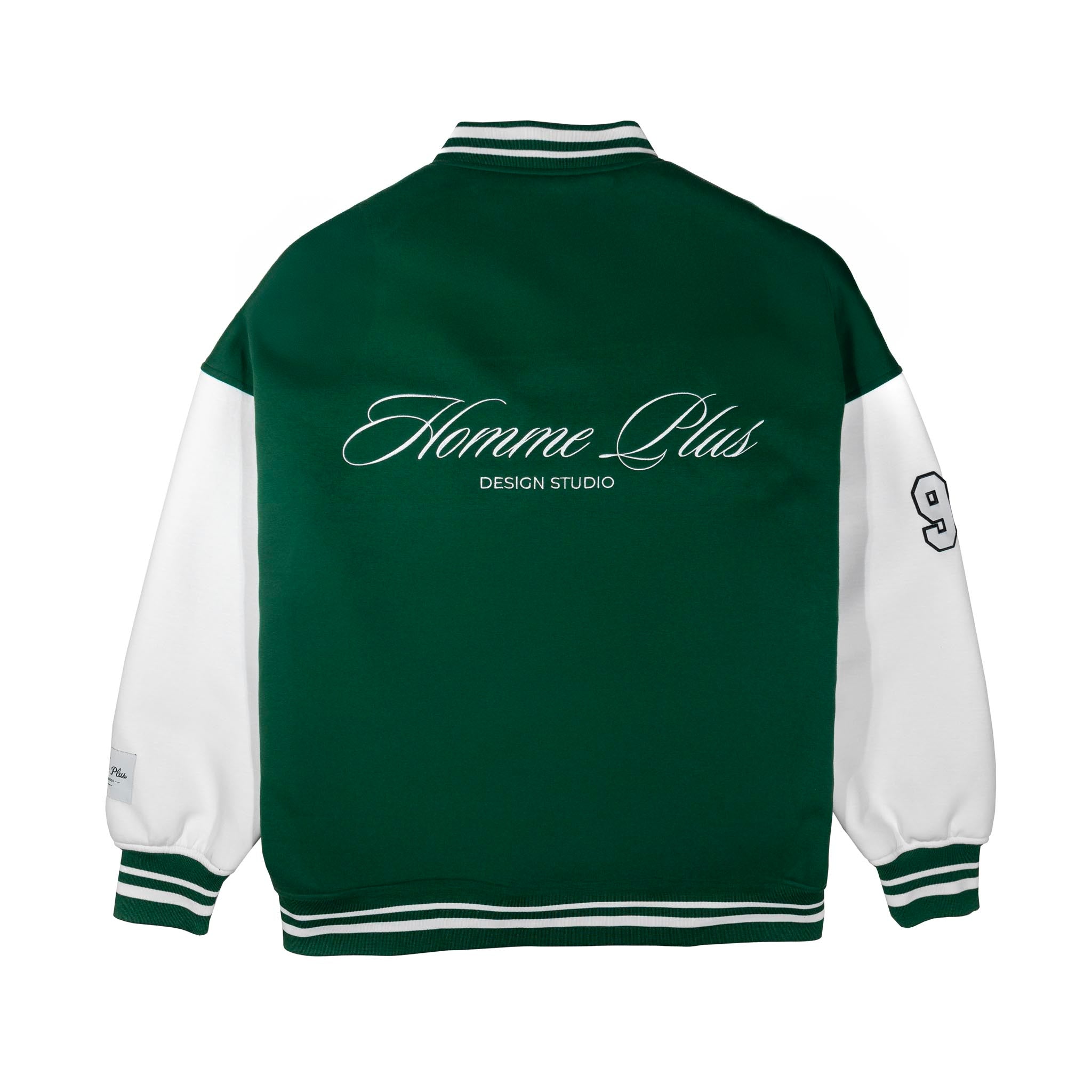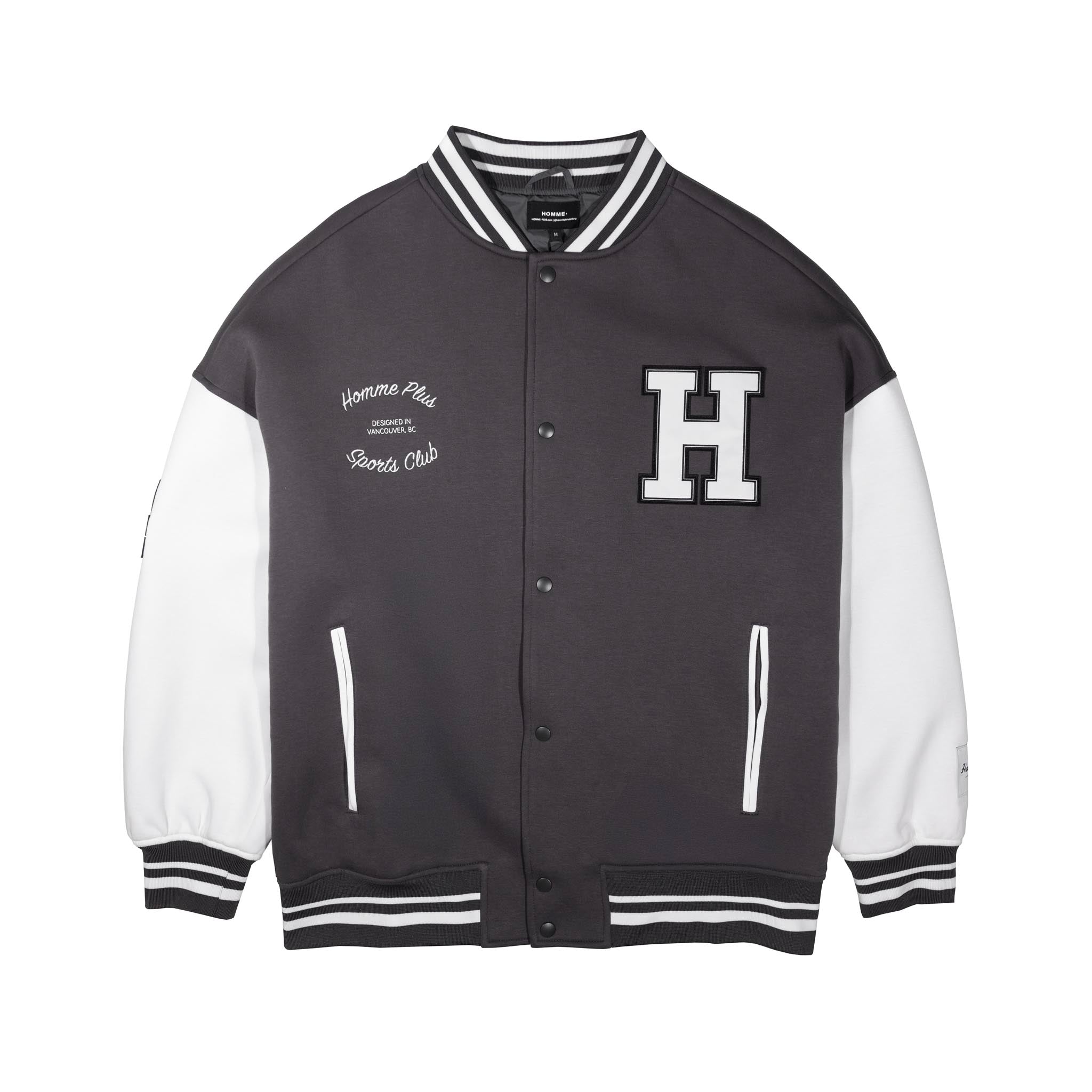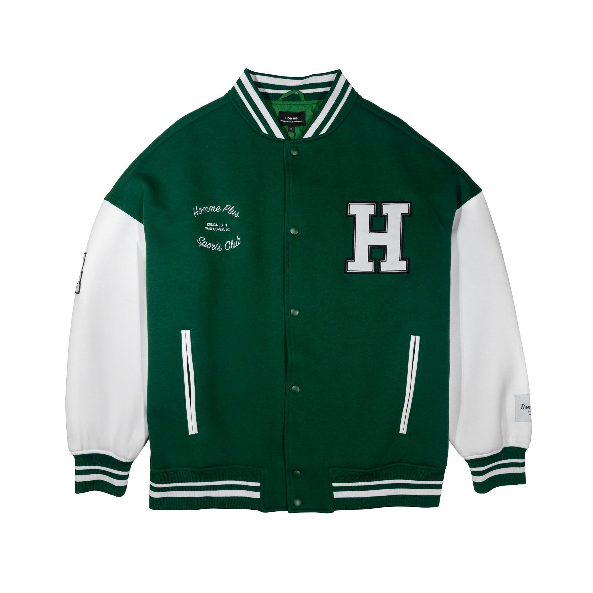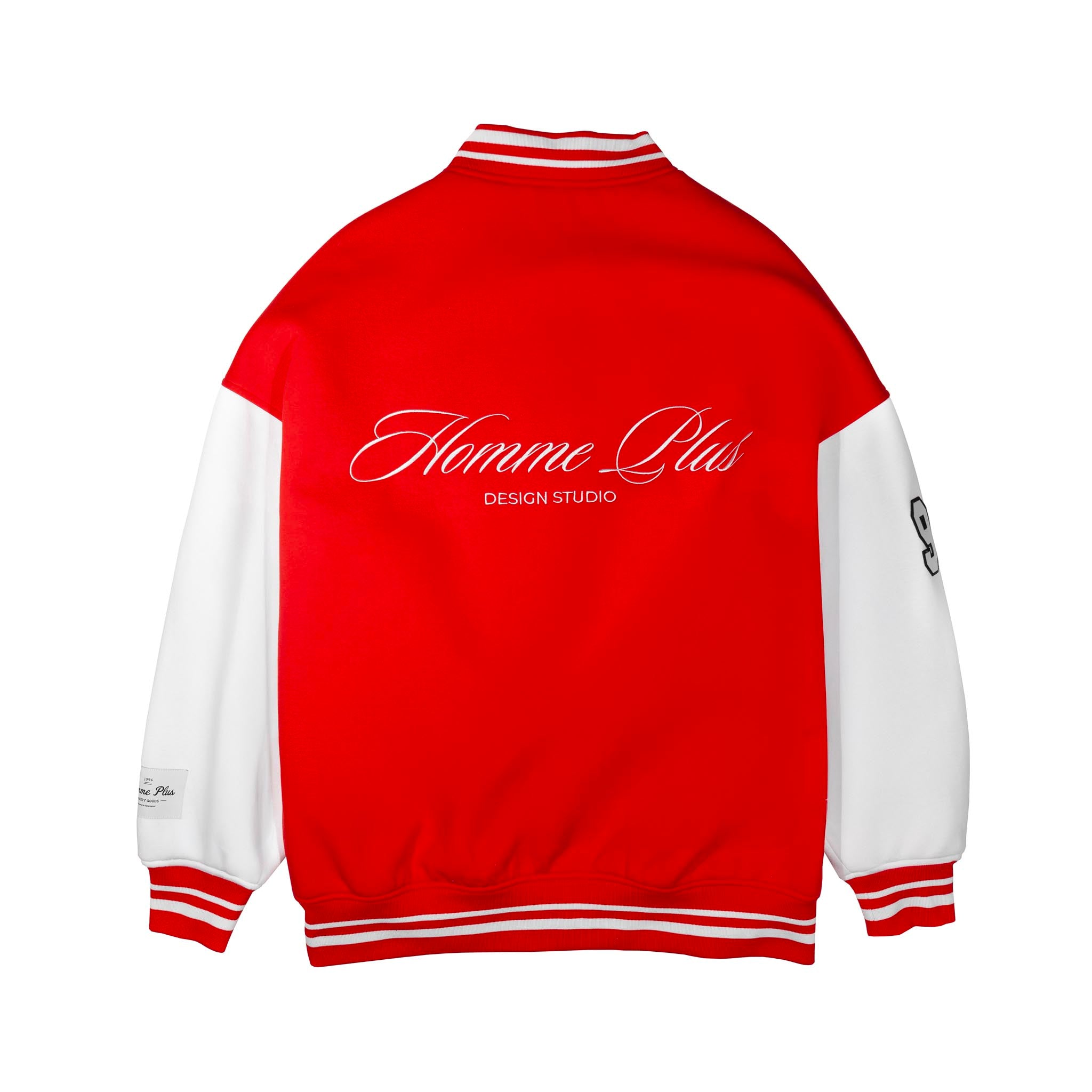 The HOMME+ Varsity Jacket delivers a classic collegiate aesthetic with its oversized fit and detailed embellishments. Featuring a woven label, fine embroidery, bold patches, and a statement back print, this jacket offers a contemporary take on a timeless style with functional interior elements.