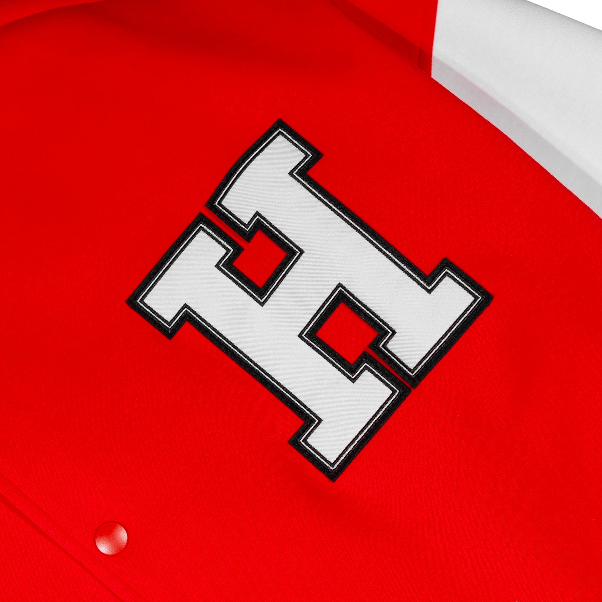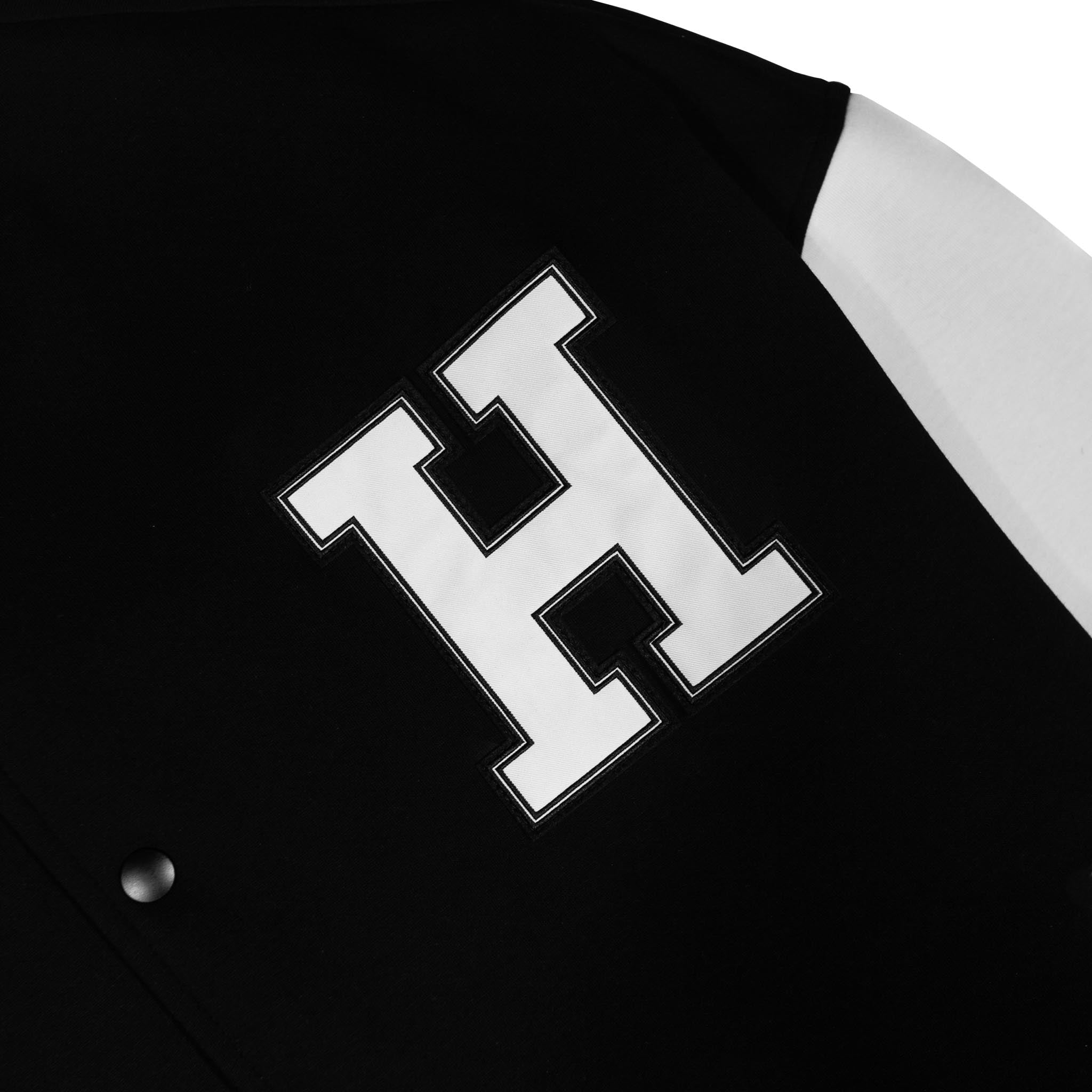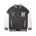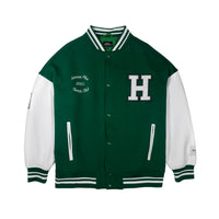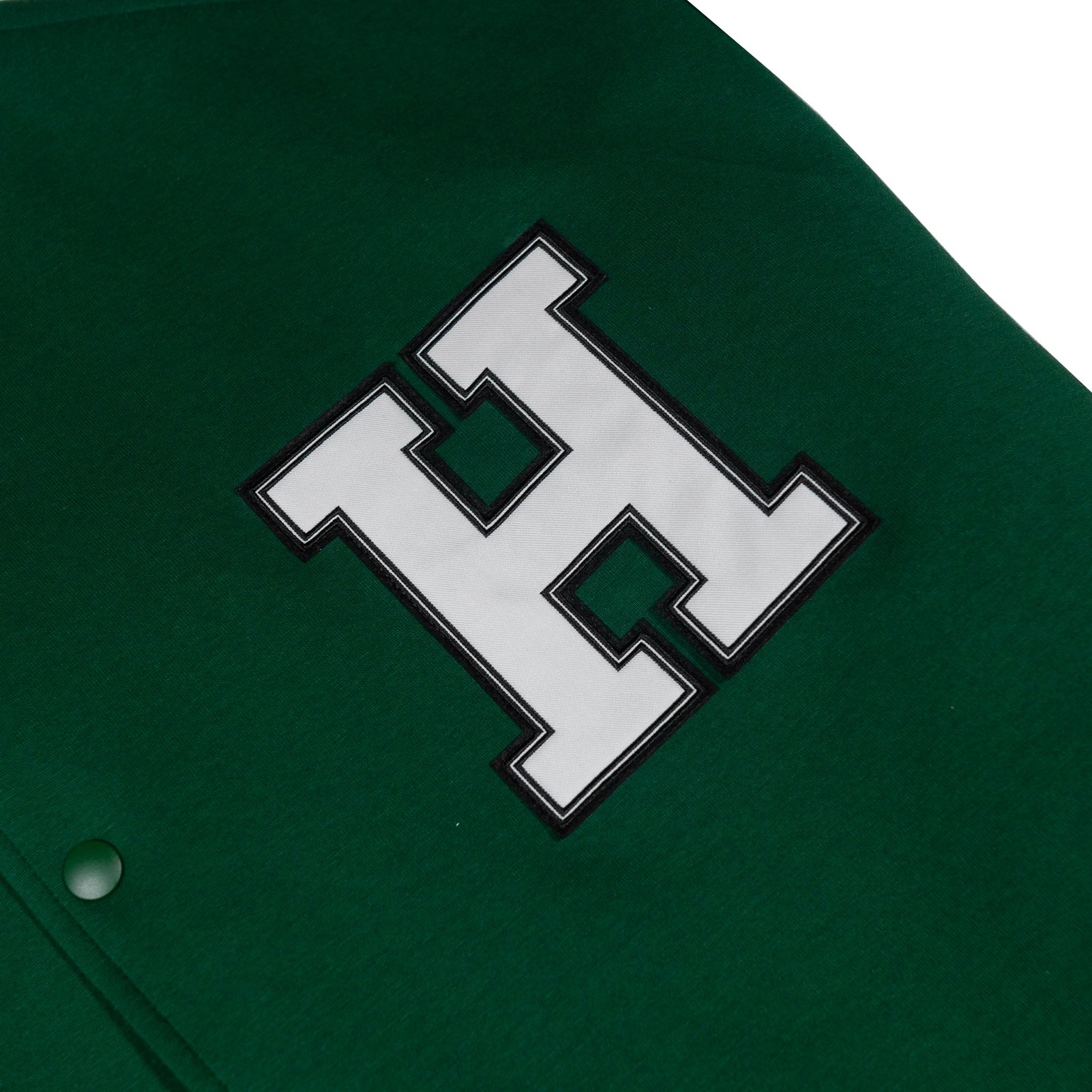 - Structure: Classic varsity jacket silhouette with snap button closure, ribbed collar, cuffs, and hem, side pockets