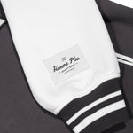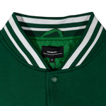 - Details: Varsity jacket woven label, embroidery on chest, sleeves, and back, applied patches, nylon interior, hidden inside pocket, cuffed wrists
